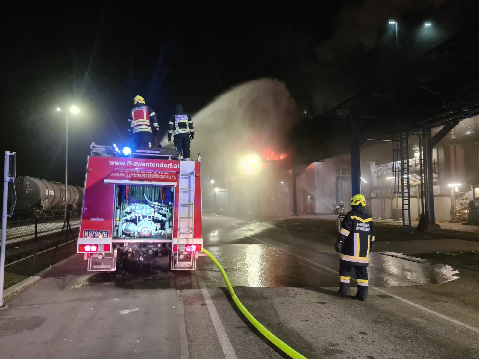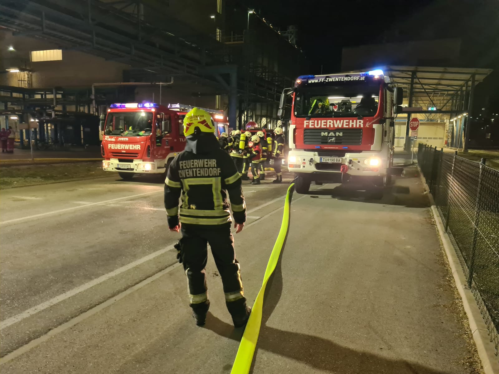 Innerhalb weniger Minuten rückte die FF-Zwentendorf mit ihrem Rüstlöschfahrzeug und Tanklöschfahrzeug zum Einsatz im Industriepark Pischelsdorf aus. Vor Ort stand ein Förderband in Vollbrand. Gemeinsam mit den Feuerwehren BTF Donauchemie, FF Erpersdorf, FF Pischelsdorf und FF Klein Schönbichl wurde sofort mit dem Löscheinsatz begonnen.