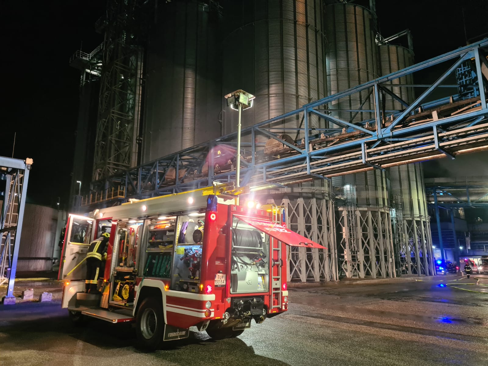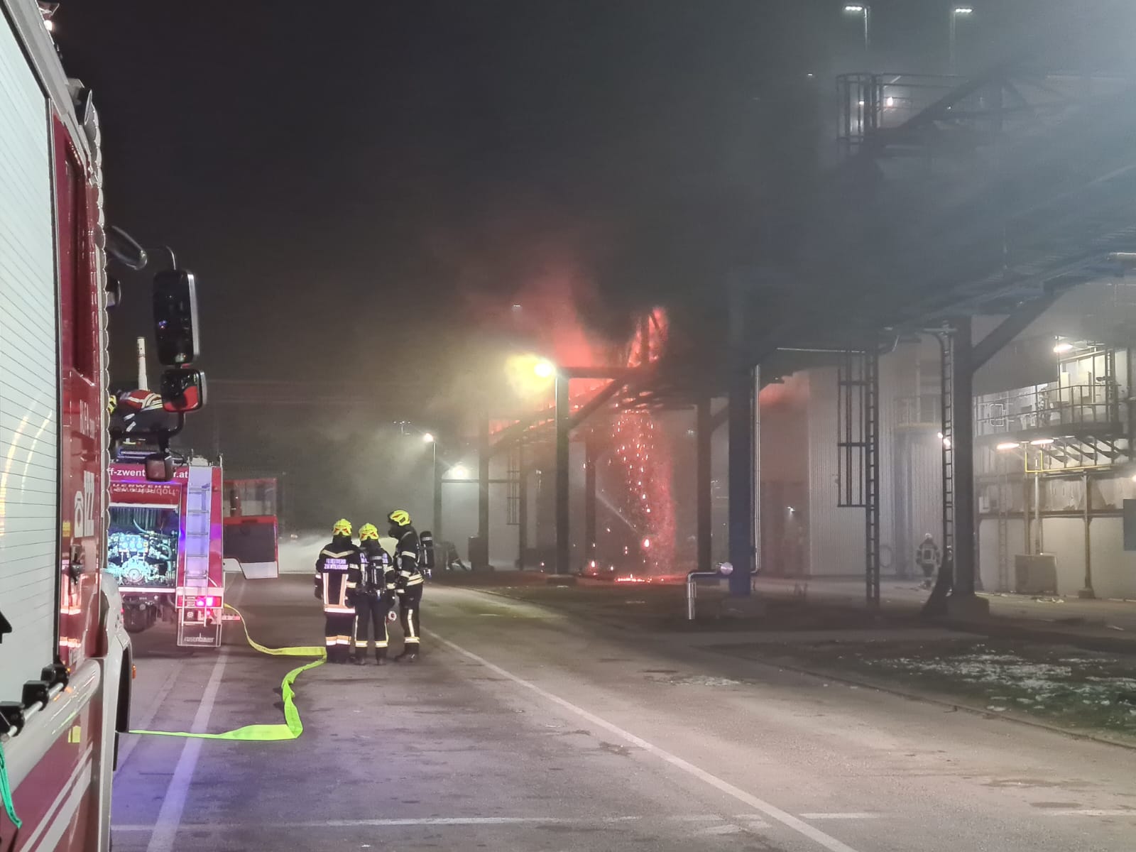 Durch diverse Löschleitungen und den Wasserwerfer des TLFA konnten die Flammen schlussendlich niedergeschlagen werden. Zur Sicherheit wurden anschließend Atemschutztrupps zum Ablöschen von Glutnestern auf das Förderband geschickt.