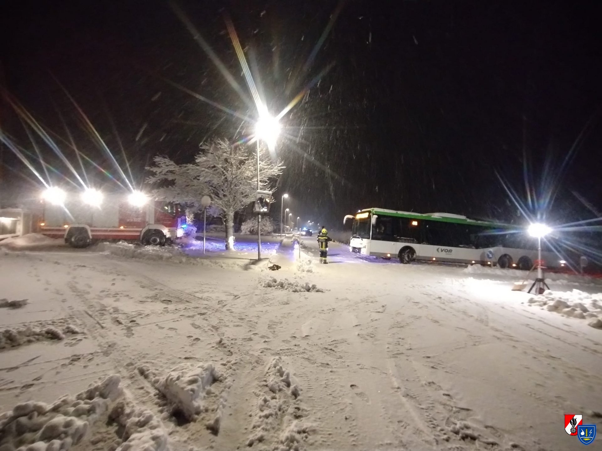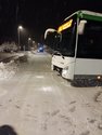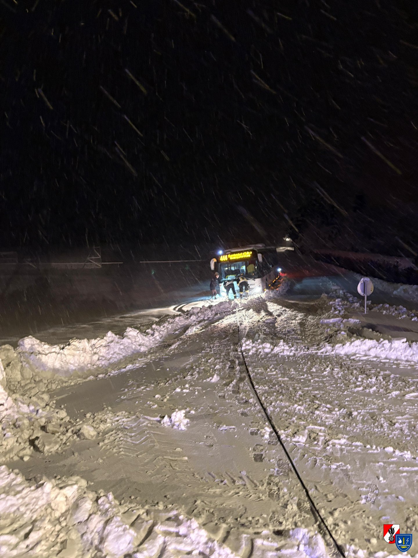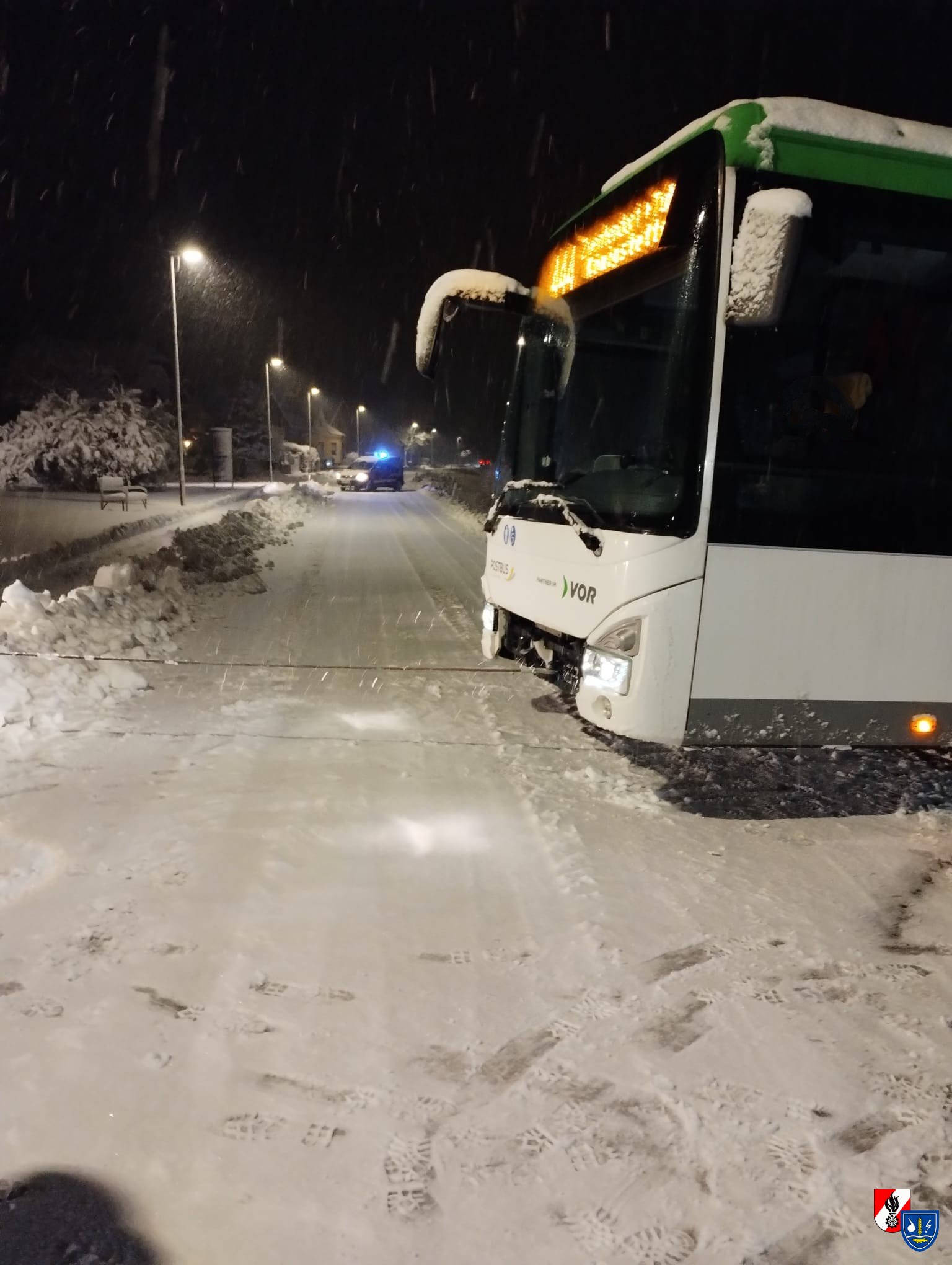 Aufgrund der winterlichen Fahrbahnverhältnisse war ein Bus von der Straße abgekommen und auf eine angrenzende Wiese abgerutscht. Durch die schneebedeckte Fahrbahn konnte das Fahrzeug nicht mehr selbstständig auf die Straße zurückkehren.