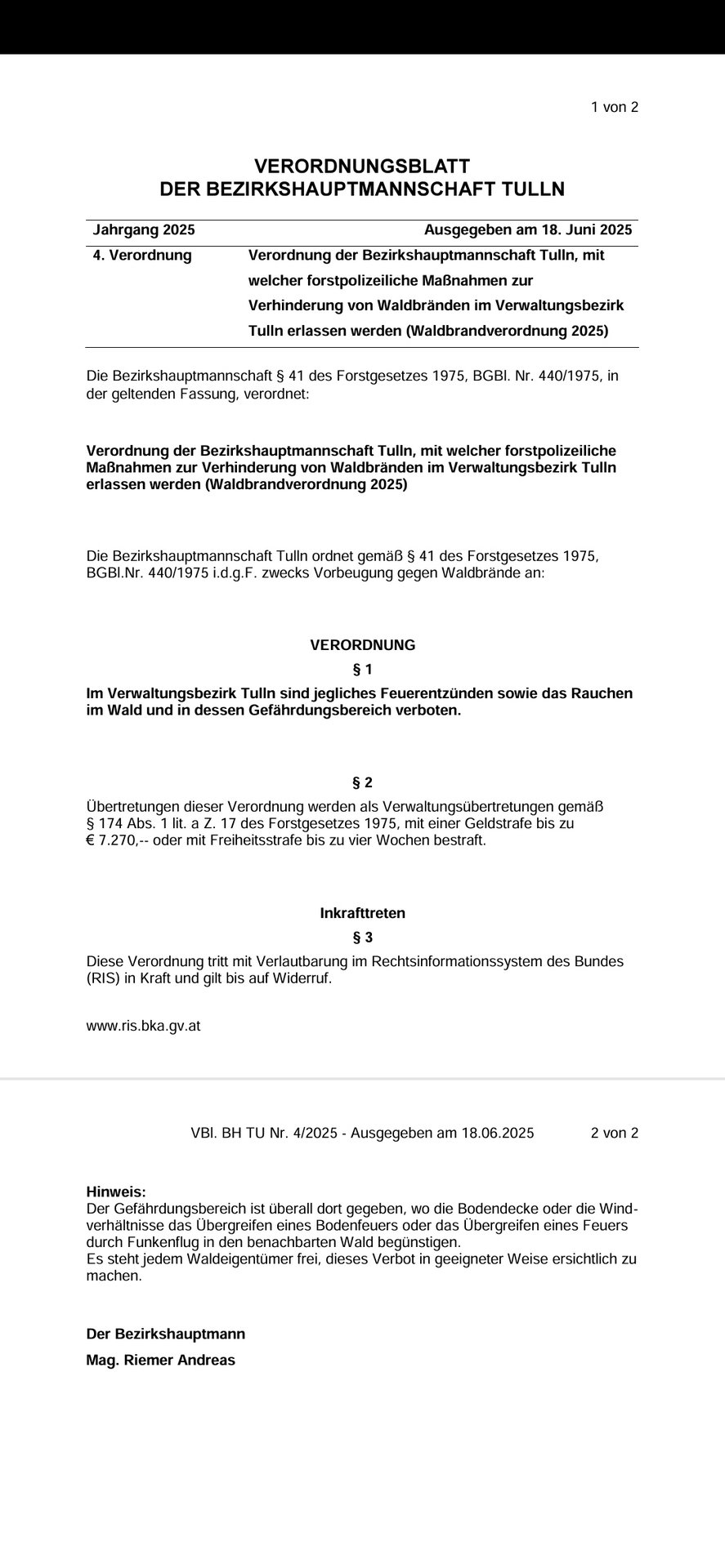 Die Verordnung der Bezirkshauptmannschaft Tulln, mit welcher forstpolizeiliche Maßnahmen zur Verhinderung von Waldbränden im Verwaltungsbezirk Tulln erlassen werden, ist am 18. Juni 2025 ausgegeben worden. (Waldbrandverordnung 2025)