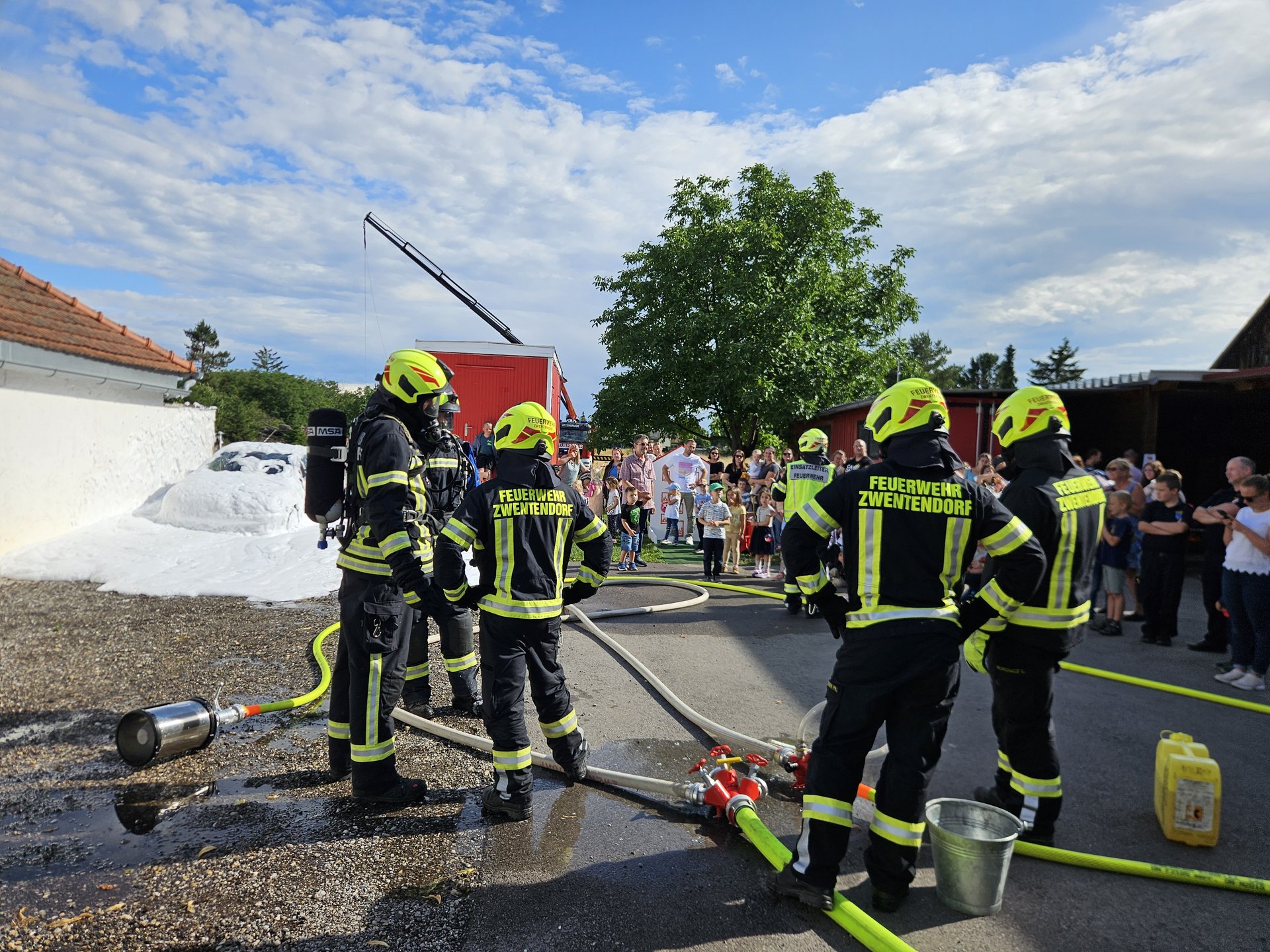 Das große Highlight des Tages war die Einsatzvorstellung. Gezeigt wurde ein realistisches Szenario – mit Martinshorn, Anfahrt und Löschangriff. Die Gäste konnten live miterleben, wie ein Einsatz abläuft und wie schnell jeder Handgriff sitzen muss.