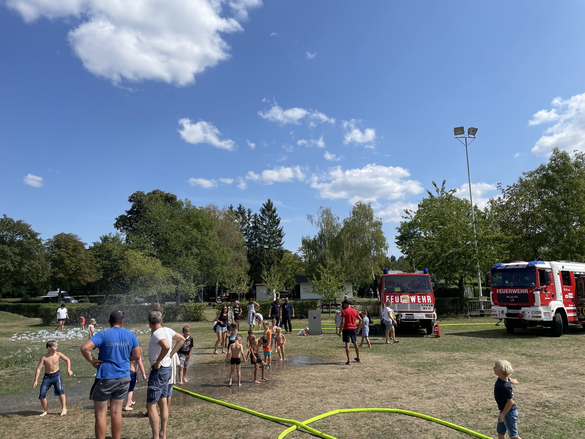 Die Kameraden der Feuerwehr sorgten mit einer Badeschaumparty, Sprühnebel und Kübelspritzen für jede Menge Spaß und eine willkommene Abkühlung bei den anwesenden Gästen. Besonders die Kinder hatten große Freude daran, sich im kühlen Nass zu erfrischen.