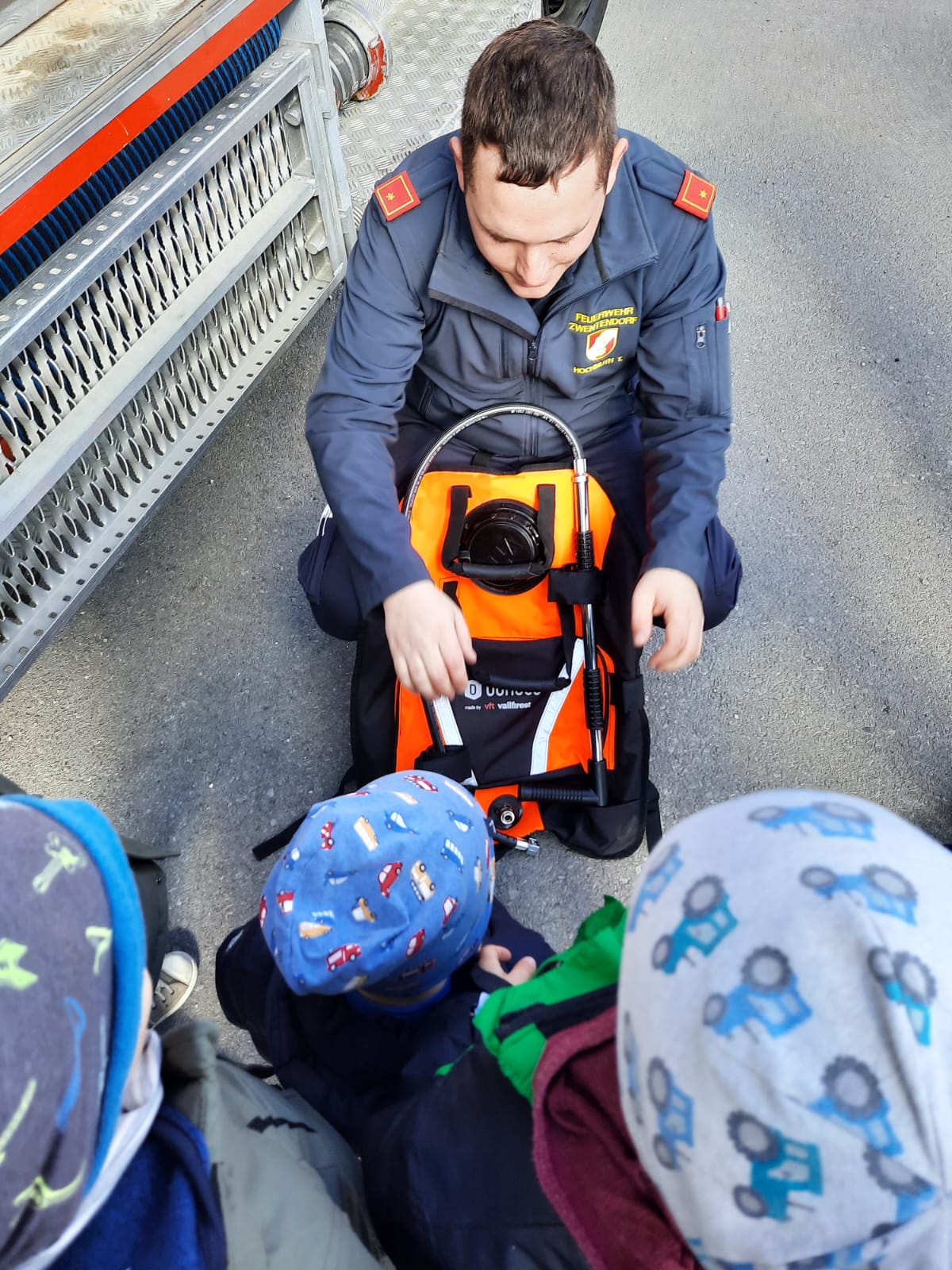 Nach einer kurzen Kennenlernrunde wurde den Kindern die Bekleidung der Feuerwehr inklusive des Atemschutzgerätes erklärt und in der Praxis vorgeführt. Dadurch konnte man den Kindern die Angst vor einem voll ausgerüsteten Feuerwehrmann nehmen.