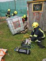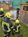 Zunächst wurde ein Zugang zum IBC-Container geschaffen. Der Behälter wurde beidseitig mit Hebekissen angehoben und laufend gesichert, um ein Nachrutschen zu verhindern. Nach dem erfolgreichen Anheben konnte die verletzte Person schonend gerettet werden.