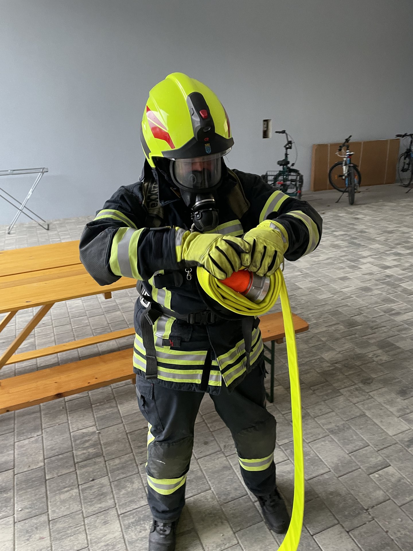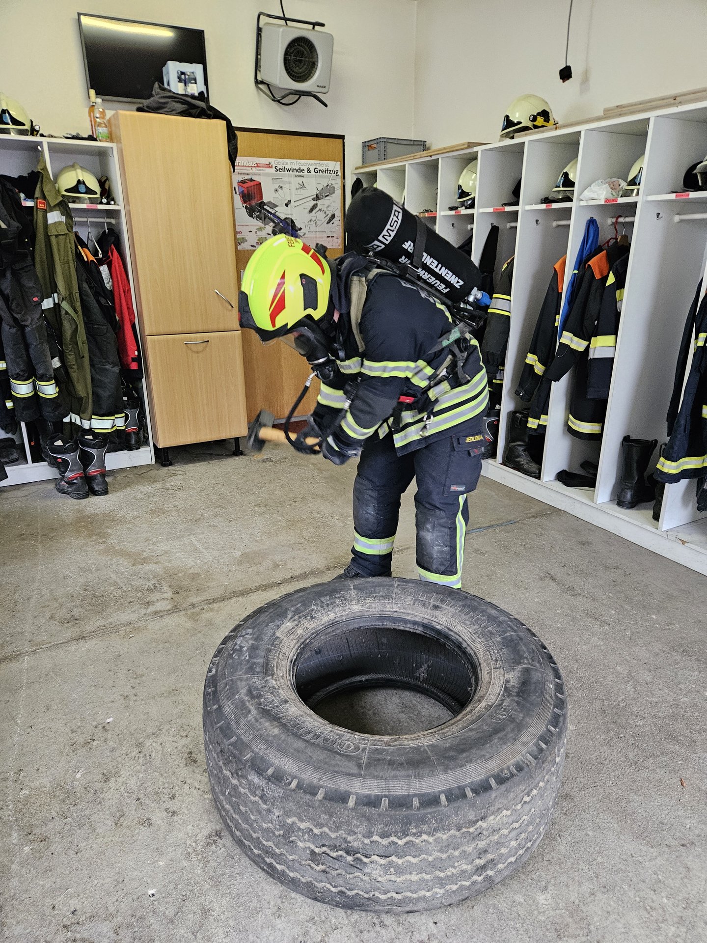 Hierbei mussten die Atemschutzgeräteträger entweder den sogenannten “Fahrrad-Test” oder den “Finnentest”, welcher aus 5 Stationen besteht, absolvieren.