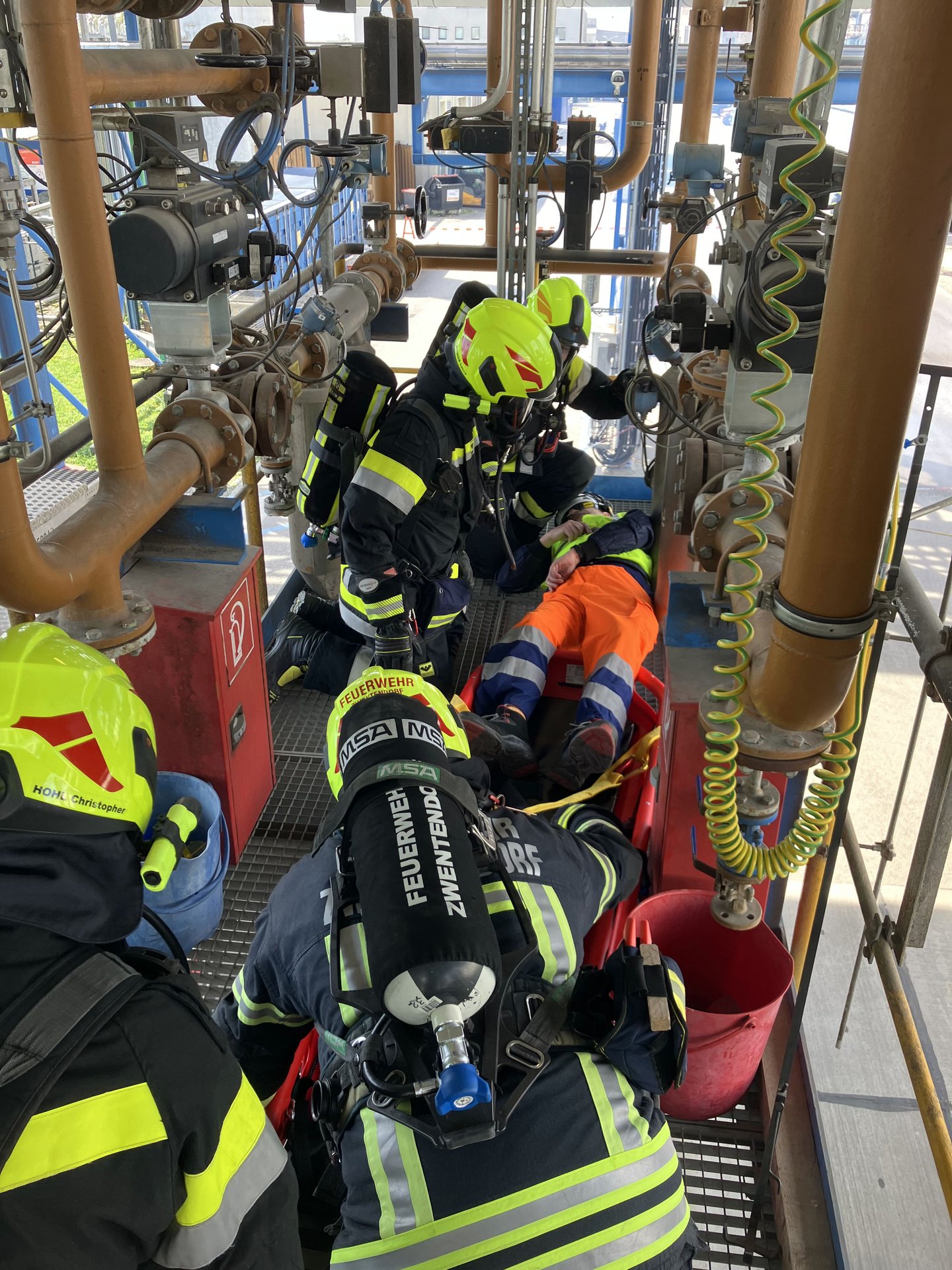 Rasch konnten die vier verletzten Mitarbeiter durch die Feuerwehrkräfte aus der Gefahrenzone gerettet und dem Rettungsdienst zur weiteren Behandlung übergeben werden.