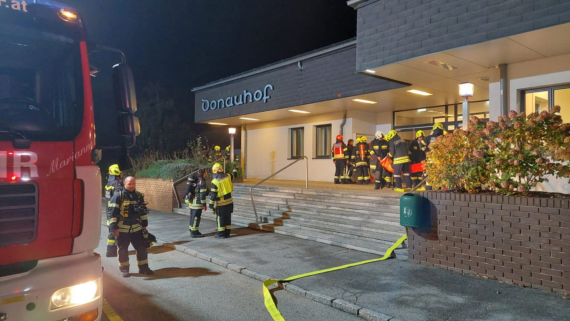 Im Bereich der Kegelbahn im Keller des Donauhofs war ein Brand ausgebrochen. Dichter Rauch hatte sich bereits im gesamten Keller ausgebreitet. Von einer Schulklasse, die sich zu diesem Zeitpunkt im Keller aufhielt, wurden noch neun Kinder vermisst.
