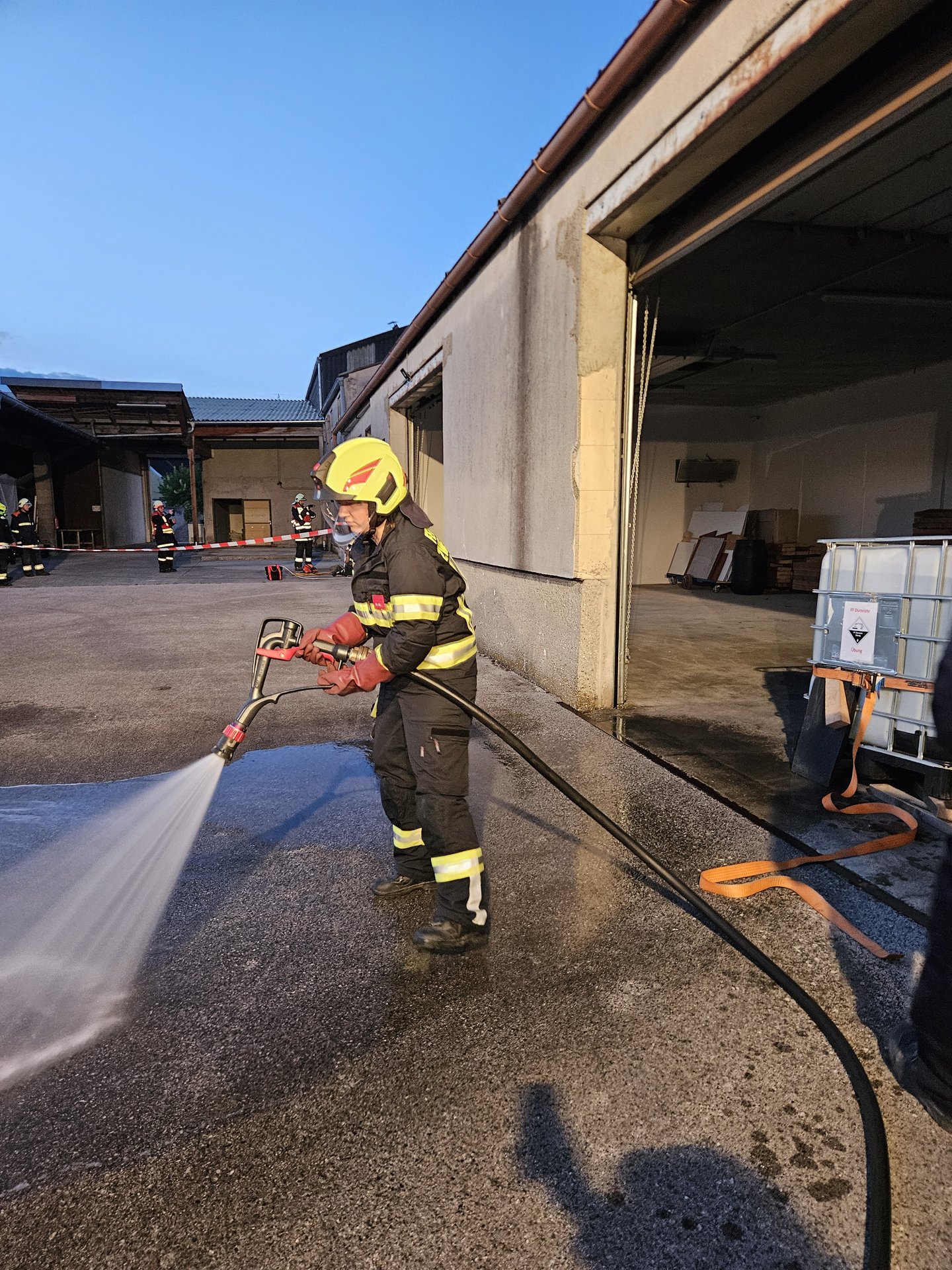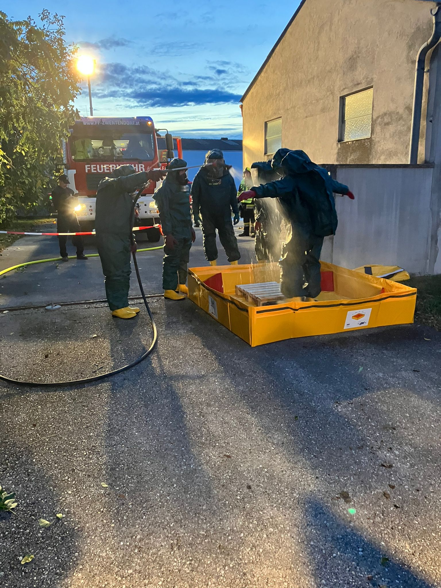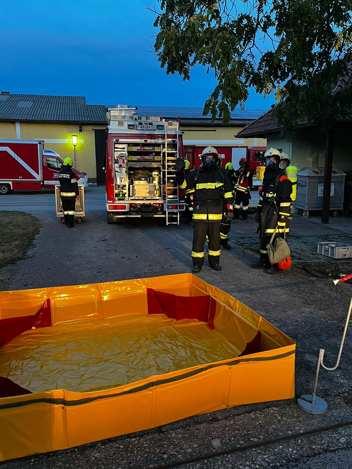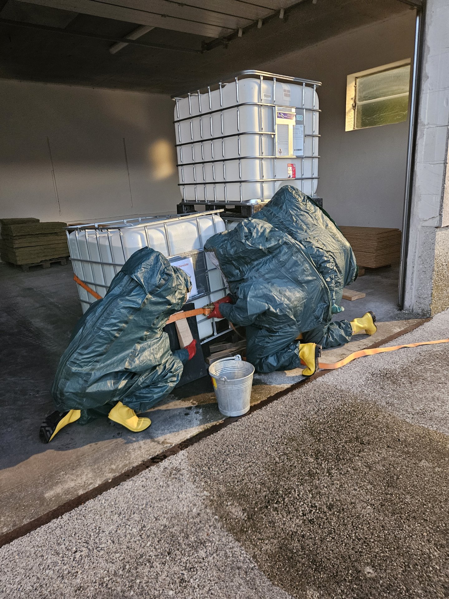 Die Feuerwehr Zwentendorf rückte daraufhin mit dem Rüstlöschfahrzeug in Richtung Dürnrohr aus. Vor Ort wurde uns von der Einsatzleitung Dürnrohr die Information übergeben, dass sich im hinteren Bereich des Brandobjekts eine Garage befindet, in der eine Person vermisst wird und ein Schadstoffaustritt vorliegen soll. Bei der Erkundung unseres Gruppenkommandanten stellte dieser fest, dass die vermisste Person unter einem vollen IBC (1.000 Liter) eingeklemmt ist und aus dem IBC eine ätzende Flüssigkeit austritt.