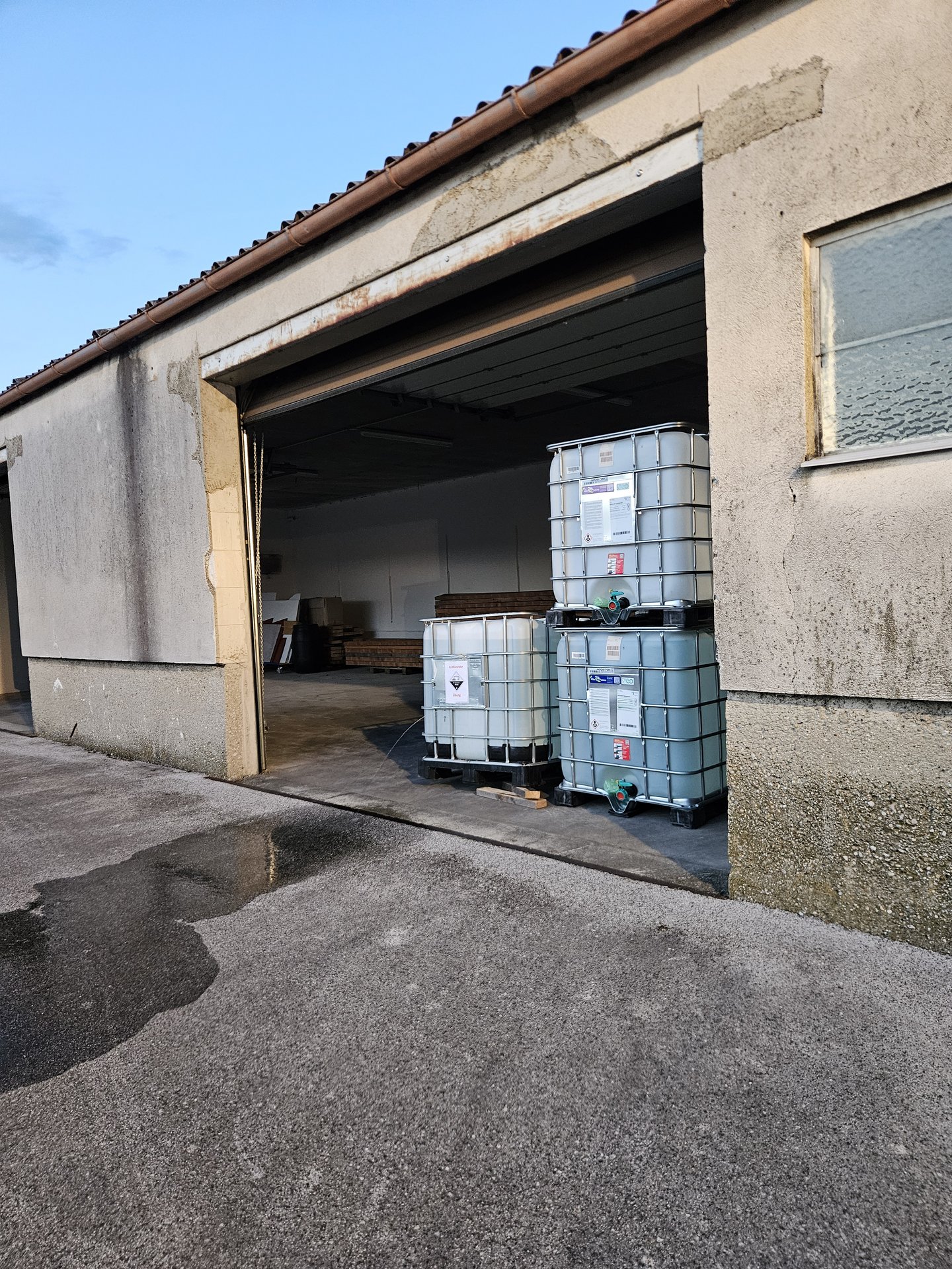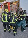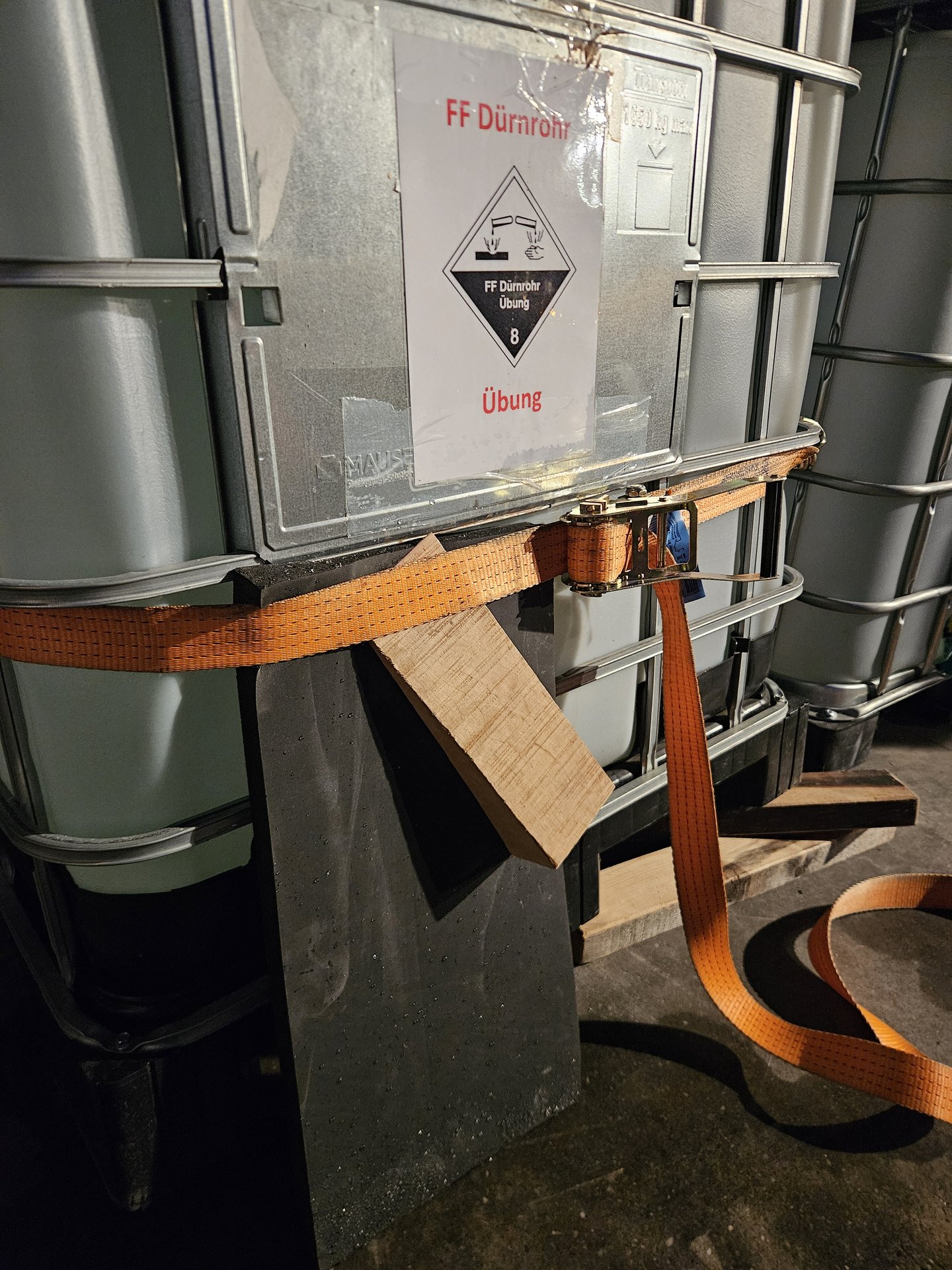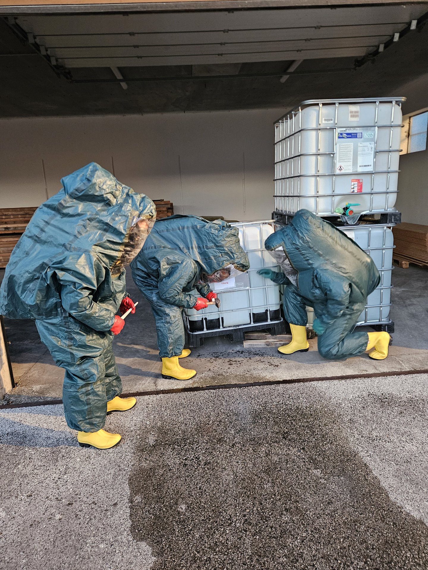 Die Feuerwehr Zwentendorf rückte daraufhin mit dem Rüstlöschfahrzeug in Richtung Dürnrohr aus. Vor Ort wurde uns von der Einsatzleitung Dürnrohr die Information übergeben, dass sich im hinteren Bereich des Brandobjekts eine Garage befindet, in der eine Person vermisst wird und ein Schadstoffaustritt vorliegen soll. Bei der Erkundung unseres Gruppenkommandanten stellte dieser fest, dass die vermisste Person unter einem vollen IBC (1.000 Liter) eingeklemmt ist und aus dem IBC eine ätzende Flüssigkeit austritt.
