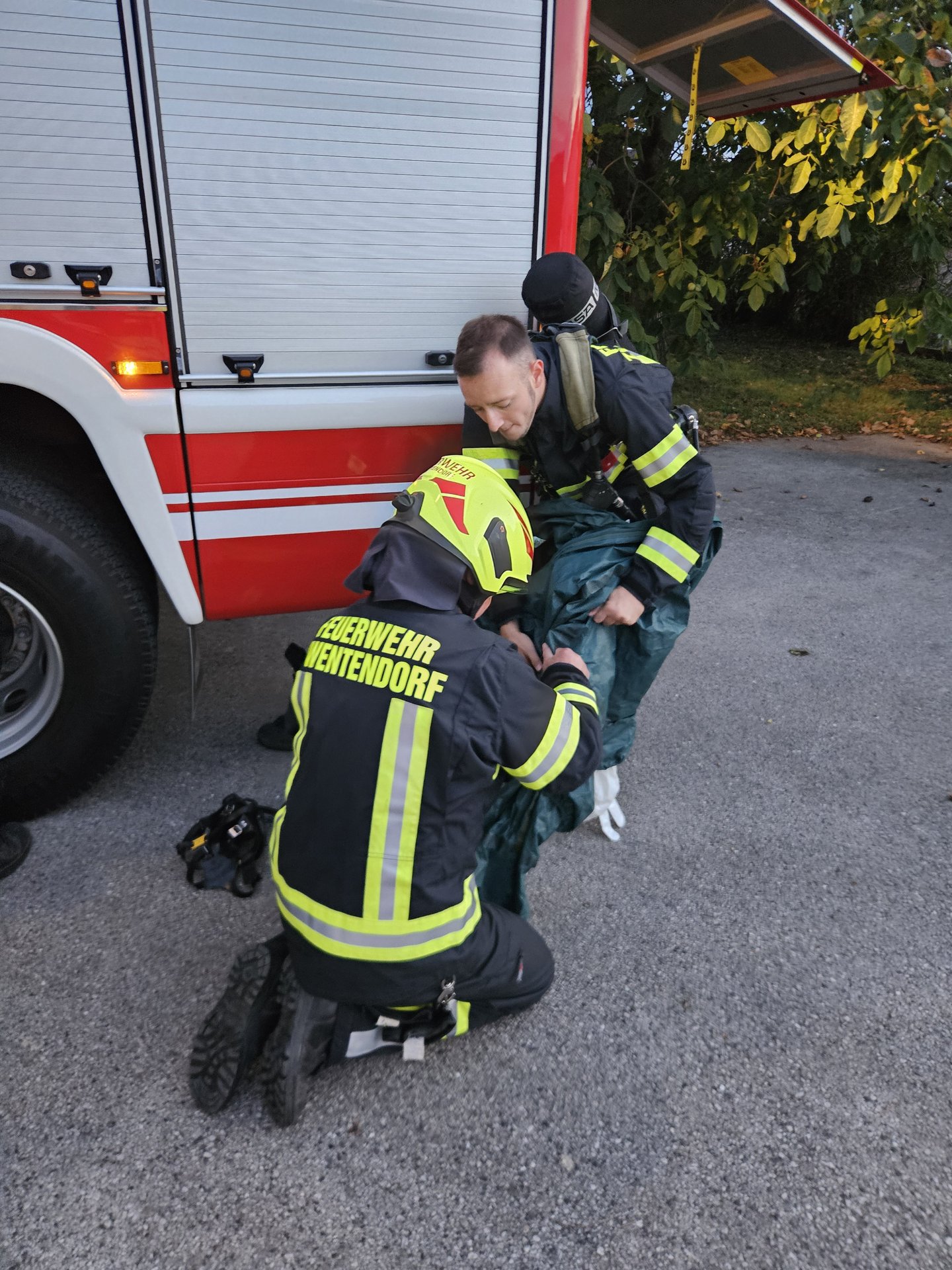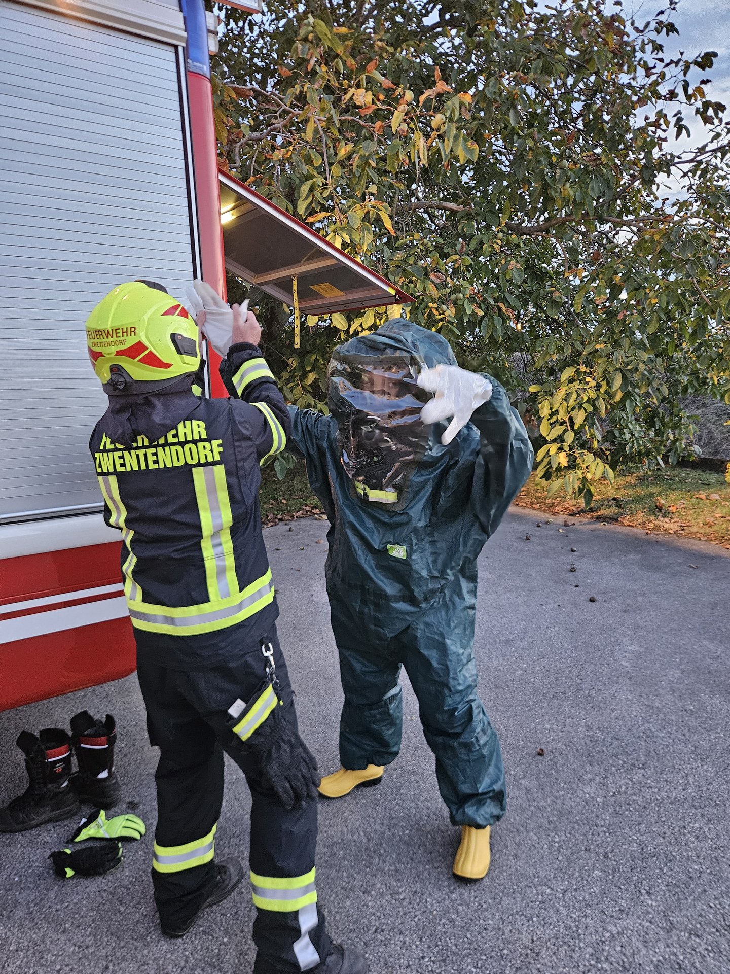 Sofort nach der Befehlsausgabe wurde durch den Atemschutztrupp Zwentendorf eine schnelle Rettung der Person unter Atemschutz und mithilfe von Brechwerkzeug durchgeführt. Parallel dazu wurde der Gefahrenbereich abgesperrt und die Chemikalienschutzanzüge der Stufe 2 für die weiteren Maßnahmen vorbereitet. Nachdem die Menschenrettung rasch durchgeführt worden war, rüstete sich der ATS-Trupp mit den Schutzanzügen aus.
