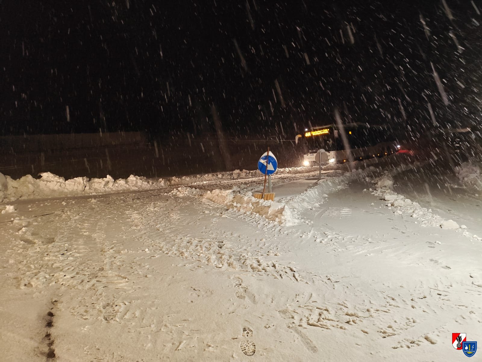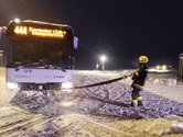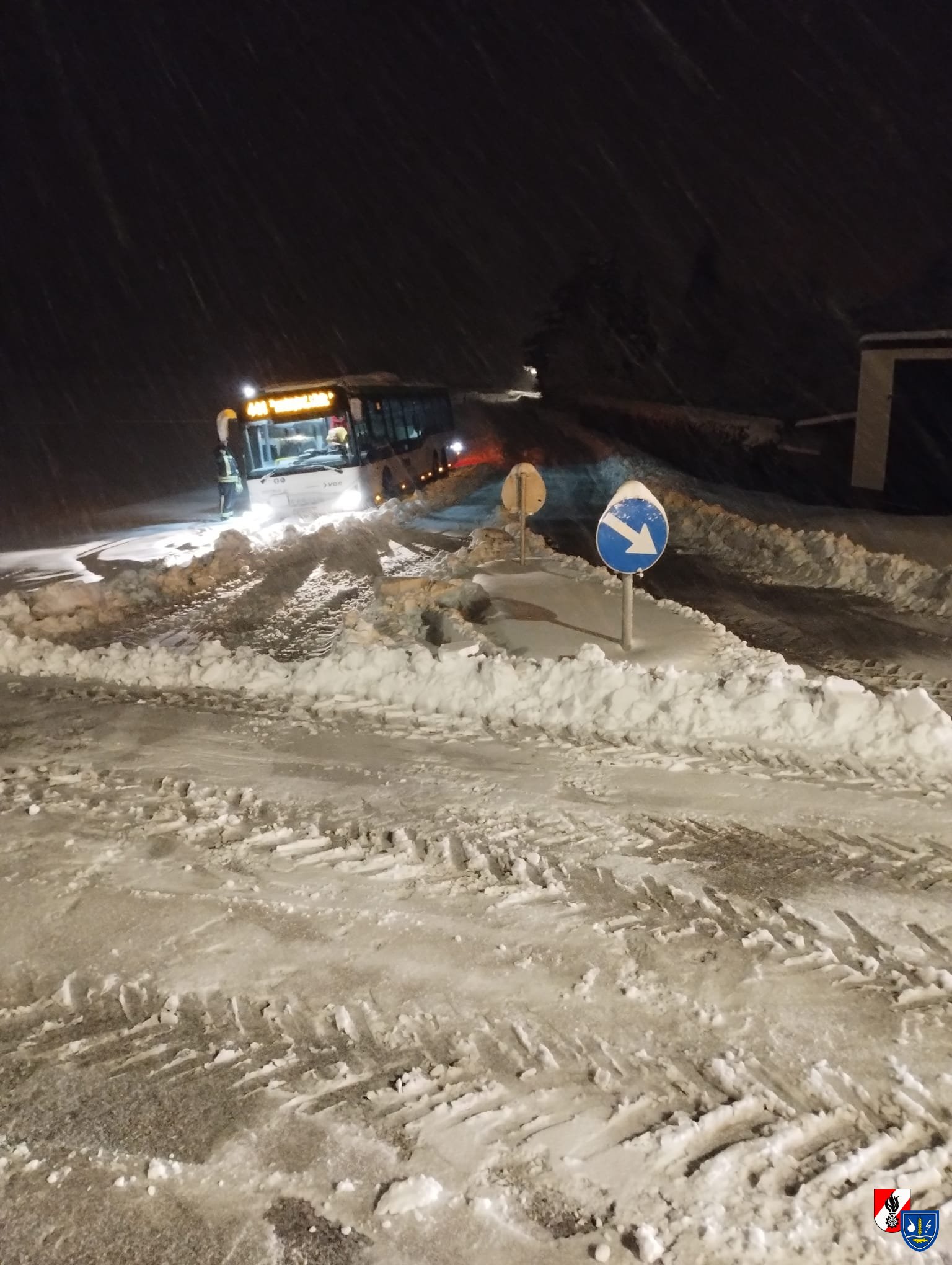 Aufgrund der winterlichen Fahrbahnverhältnisse war ein Bus von der Straße abgekommen und auf eine angrenzende Wiese abgerutscht. Durch die schneebedeckte Fahrbahn konnte das Fahrzeug nicht mehr selbstständig auf die Straße zurückkehren.